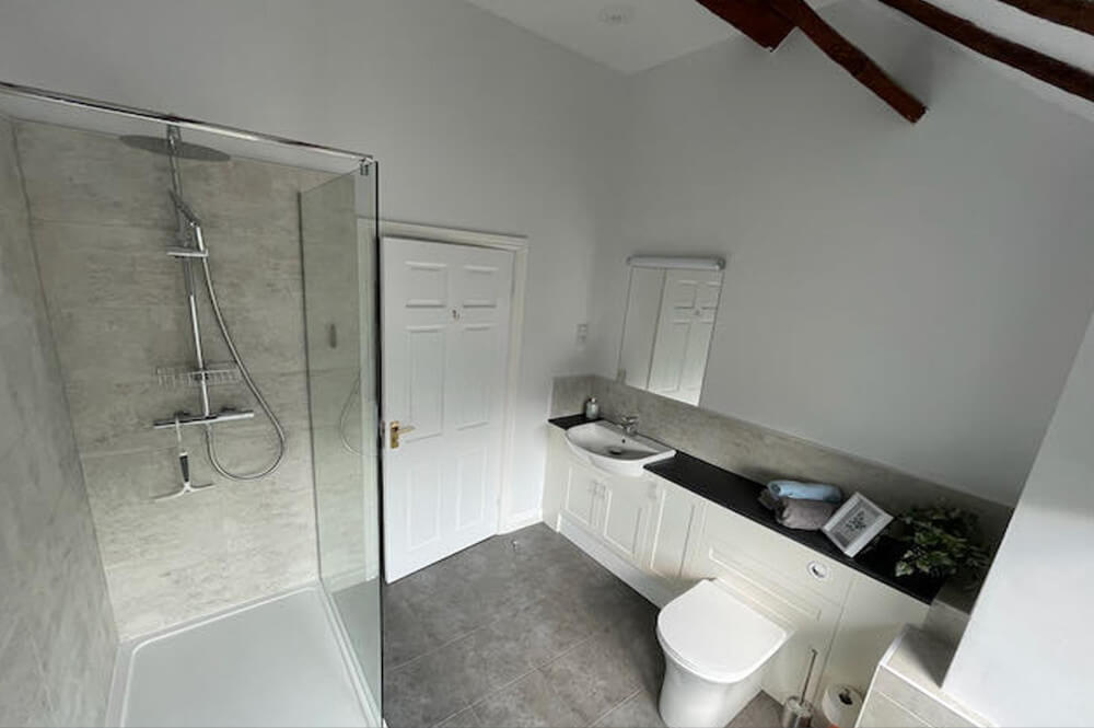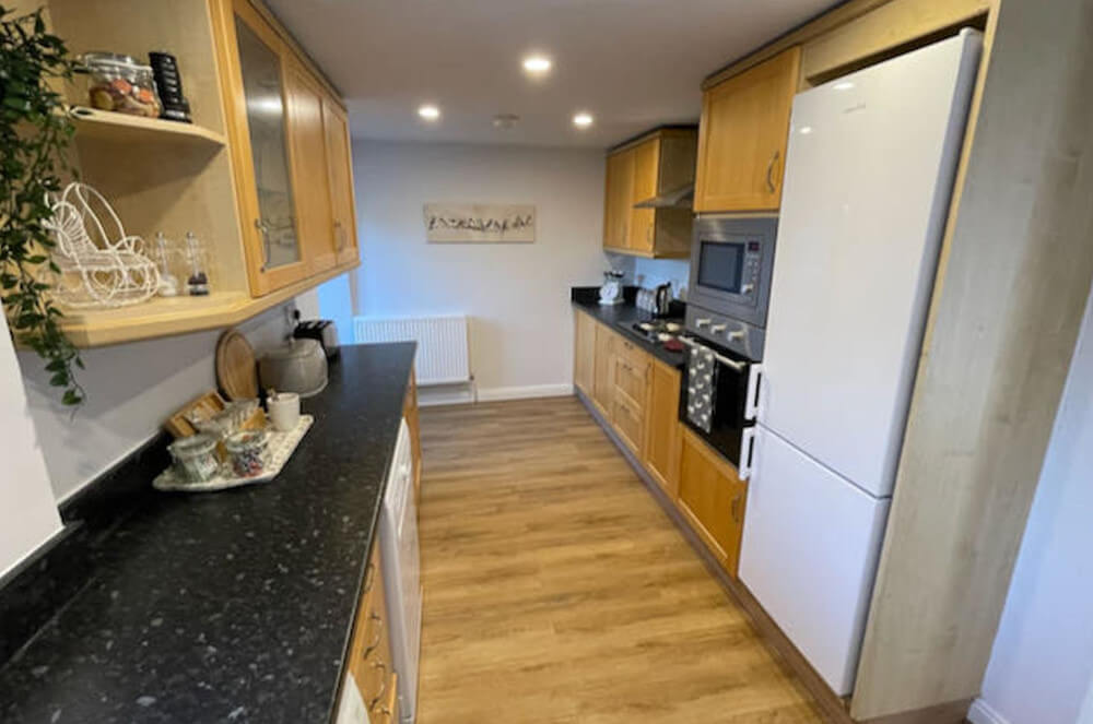 The well-appointed kitchen features modern appliances, including a dishwasher, fridge freezer, electric hob, oven, and microwave. We’ve thought of everything, providing essential supplies such as tea, coffee, sugar, cling film, foil, and bin liners to make your stay hassle-free.