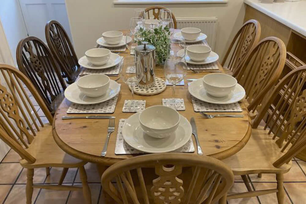 The well-appointed kitchen features modern appliances, including a dishwasher, fridge freezer, electric hob, oven, and microwave. Essential supplies such as tea, coffee, sugar, cling film, foil, and bin liners are provided to make your stay as convenient as possible.